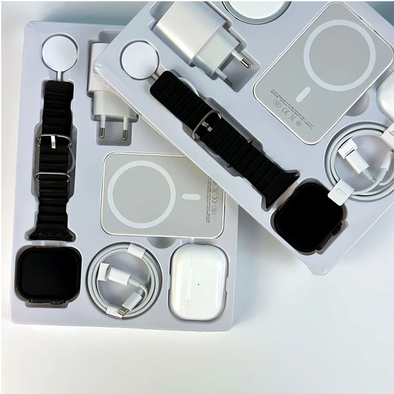 این محصول شامل یک ساعت هوشمند طرح اپل سری اولترا و یه هندزفری بیسیم، طرح ایرپاد اپل هست. این ساعت دقیقا مشابه مدل اولترا اپل هست، اندازه صفحه نمایش 2.02 اینچ ، با پشتیبانی از زبان فارسی ،هر سه دکمه فعال از جمله دکمه مجیک باتن یا چرخشی . مجهز به اسپیکر و میکروفون داخلی و با اتصال به موبایل، علاوه بر مکالمه میتونید به موسیقی مورد علاقهتون گوش کنید. دارای امکاناتی همچون ماشین حساب، کرنومتر، اعلان دریافت و نمایش پیامک هم داره. بند این ساعت مشابه اپل واچ سری اولترا از نوع ocean میباشد. البته باید بدونید که همه نمونههای طرح اپل (از جمله همین مدل) امکان اندازهگیری شاخصهای سلامتی مثل سنسور اکسیژن، ضربان قلب یا فشار خون را ندارند و اعداد نمایش داده شده فقط جنبه دکوری و نمایشی دارد. پک این محصول شامل 1 عدد کابل شارژر, ایرپاد پرو, بند سیلیکونی, پاوربانک وایرلس, شارژر وایرلس, مگ سیف اپل, یک عدد آداپتور میباشد.