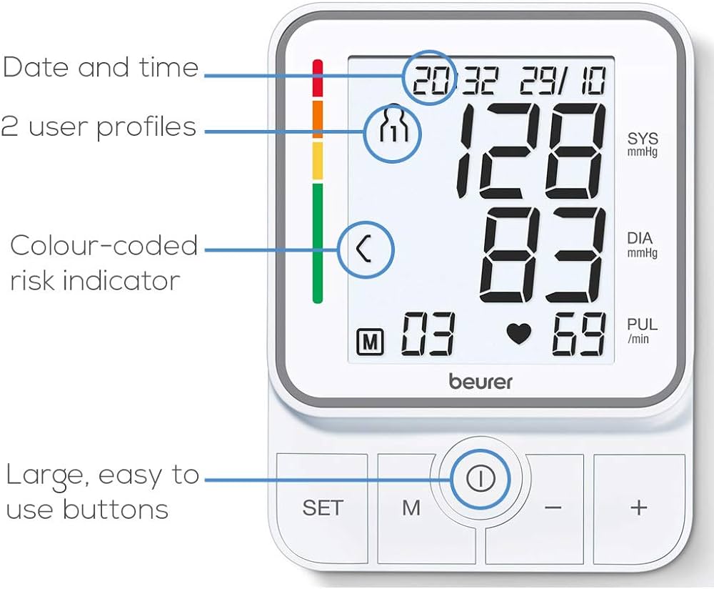 کاف نوآورانه easyClip: قرارگیری ساده با یک دست به بازو وصل میشود. اندازه گیری سریع و راحت فشارصفحه نمایش XL با نور پس زمینه سفید با خوانایی آسان/اندازه گیری تمام اتوماتیک فشار خون و نبض در بازو/میانگین تمام مقادیر اندازه گیری ذخیره شده/دو حافظه کاربر با 100 اندازه گیری برای هر کدام/نشانگر خطرغربالگری آریتمی/برای دور بازو 22 تا 42 سانتی متر/تاریخ و زمان/خاموش شدن خودکا/رهشدار خطای اندازه گیری